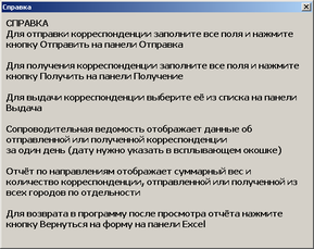 Используя средства Excel по созданию окон диалога и написание макросов на VB, создать приложение, автоматизирующее учет отправленной и полученной корреспонденции на почте. Приложение должно выполнять следующие функции: