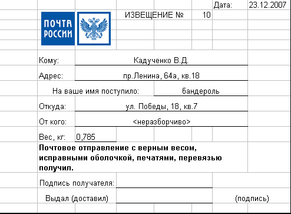 К исходным данным также можно отнести два бланка квитанций, ячейки которых заполняются нужными значениями. На рисунке 4 представлен образец извещения, доставляемого на дом получателю, если на его имя получена корреспонденция.