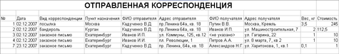 Таблица отправленной корреспонденции содержит следующую информацию: порядковый номер корреспонденции, дату отправки, вид корреспонденции (посылка, бандероль или заказное письмо), пункт назначения, ФИО и точный адрес отправителя, ФИО и точный адрес получателя, вес, стоимость отправки. Таблица полученной корреспонденции содержит полностью аналогичные столбцы плюс 1 дополнительный столбец «Выдано», содержащий значение «ВЫДАНО», если корреспонденция выдана получателю, и пустую ячейку в противном случае.