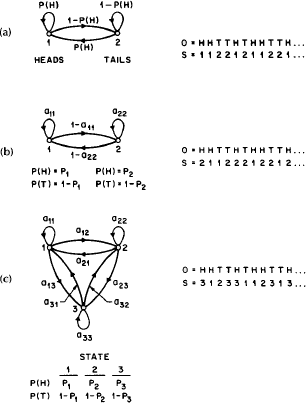Три марківські моделі, які можуть описати експеримент з монетою, що підкидається. (а) 1 монета бере участь у підкиданні, (2) 2 - монети, (3) - три монети.