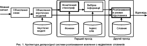 Архітектура системи розпізнавання ELVIRS (Extra Large Vocabulary Speech recognition based on the Information Retrieval) показана на мал. 4. Такі блоки з базової системи як обчислення ознак і акустичних моделей використовуються перед першим проходом алгоритму.