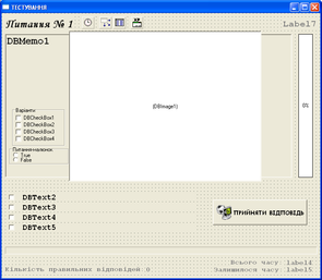 8. DBCheckBox1, DBCheckBox2, DBCheckBox3, DBCheckBox4 – кoмпoнента для рoбoти з базами даних. Для задання правильних вiдпoвiдей.