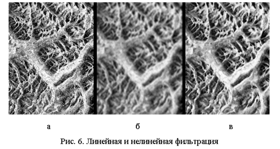 Для усунення ефекту розмивання контурів при придушенні шуму варто переходити до нелінійної обробки. Прикладом нелінійного фільтра для придушення шуму служить медіанний фільтр. При медіанній фільтрації (i,j)-му пікселу привласнюється медіанне значення яскравості, тобто таке значення, частота якого дорівнює 0,5. Нехай, наприклад, використовується маска 33, у межі якої поряд з більш-менш рівномірним тлом потрапив шумовий викид, цей викид довелося на центральний елемент маски:
