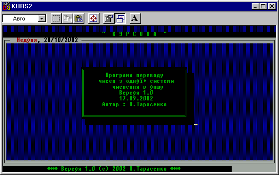 gotoxy(1,24);write(' *** Calculator Version 1.0 Copyright (c) 1997 by L.Tarasenko *** ');