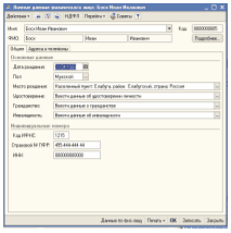 Заполняем справочник Физические лица. Кнопкой Добавить добавляем новое физическое лицо: вводим ФИО, дату рождения, пол, место рождения, и другие сведения, далее переходим на закладку номера и телефоны и вводим соответствующие данные. Для ввода информации о вычетах заходим на закладку НДФЛ указываем, дату, вычет применяется, код 108/101, количество детей. Закрываем нажатием кнопки ОК.