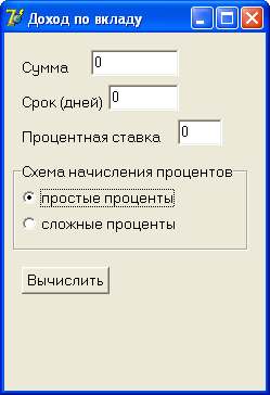Целью этой программы является вычисление дохода по вкладу. Программа позволяет вычислять доход от вклада в двух вариантах: вклад с простыми процентами и вклад со сложными процентами. В программе организован ввод суммы вклада, срока вклада, величины процентов, а также выбор варианта начисления процентов.