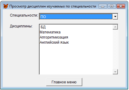 Данный модуль вызывается при нажатии на кнопку «просмотр дисциплин изучаемых по специальности» из главной формы. В данном модуле на форме размещены два объекта label для надписи. Также размещен объект ComboBox в котором находится список всех специальностей из таблицы special с помощью свойств: RowSourceTyp=6–Fields, RowSource=special.name, style=2-Dropdown List. По умолчанию уже выбран объект – первый из списка в таблице. Для объекта ComboBox используется событие InteractiveChange. На форме размещен объект ListBox, он используется для отображения дисциплин которые выводятся с помощью события InteractiveChange объекта ComboBox. Также на форме размещен объект command, который служит для перехода к главной форме «Гланое меню». Для него используется событие Click.