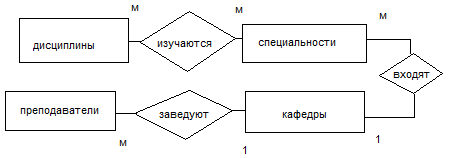 Дисциплины относятся к специальностям как связь М:М – много ко многим, поскольку специальности содержат для обучения несколько дисциплин, а дисциплины в свою очередь могут изучаться в разных специальностях. Специальности относятся к кафедрам как связь М:1 – много к одному, поскольку несколько специальностей может входить в одну кафедру, но при этом одна специальность может входить только в одну кафедру. Преподаватели относятся к кафедрам как связь М:1 – много к одному, так как несколько преподавателей могут заведовать одной кафедрой, но не несколькими сразу.