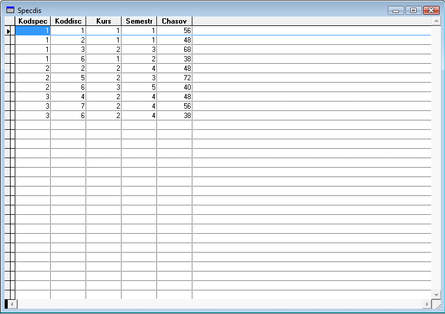 Specdis(kodspec,koddisc,kurs,semester,chasov)