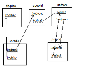 Первичный ключь koddisc в таблице disiples связан с внешним ключем koddisc в таблице specdis, первичный ключь kodspec в таблице special связан с внешним ключем kodspec в таблице specdis, gервичный ключь kodkaf в таблице kafedrs связан с внешними ключами kodkaf в таблице special и kodkaf в таблице prepod, первичный ключь kodprep в таблице prepod связан с внешним ключем kodprep в таблице kafedrs.