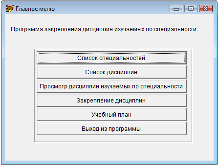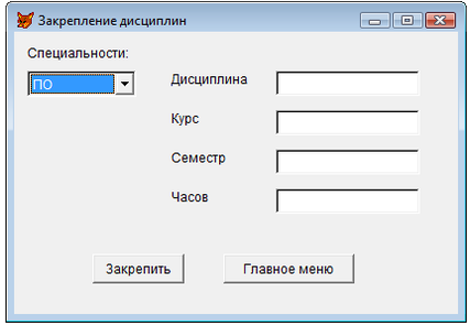 Данный модуль вызывается из главной формы при нажатии на кнопку «Закрепление дисциплин». В данном модуле на форме размещены пять объектов label для надписи и 4 объекта TextBox для записи. Также размещен объект ComboBox в котором находится список всех специальностей из таблицы special с помощью свойств: RowSourceTyp=6–Fields, RowSource=special.name, style=2-Dropdown List. По умолчанию уже выбран объект – первый из списка в таблице. Для объекта ComboBox используется событие InteractiveChange. Также размещен объект Command для перехода на форму «Главное меню».