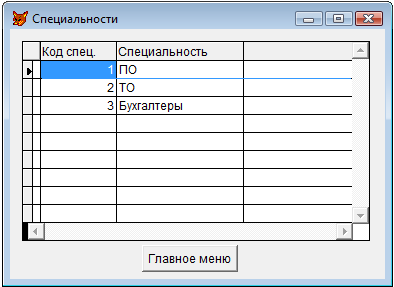 Данный модуль вызывается из главной формы при нажатии на кнопку «Специальности». На данной форме размещен объект grid который имеет свойство readonly=True, чтобы пользователь мог только просматривать информацию, так же у объекта grid имеются дополнительные компоненты header для каждой колонки (всего их 2) , в свойствах caption которых описывается название колонки. Объект Column1 (первая колнка) связан с атрибутом kodspeс (код специальности) таблицы special для вывода в этой колонке всех кодов. Для второй колонки используется атрибут names таблицы special, чтобы в данных колонках были записаны названия специальностей. Также на форме размещена кнопка перехода на форму «Главное меню»