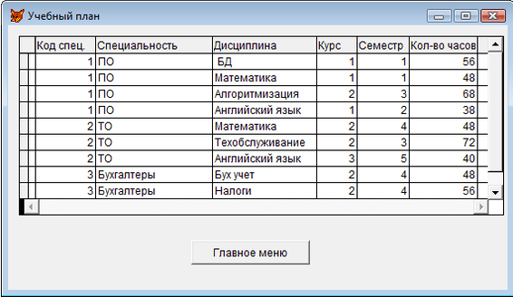 Данный модуль вызывается из главной формы при нажатии на кнопку «Учебный план». На данной форме размещен объект grid который имеет свойство readonly=True, чтобы пользователь мог только просматривать информацию, так же у объекта grid имеются дополнительные компоненты header для каждой колонки (всего их 6) , в свойствах caption которых описывается название колонки. Объект Column1 (первая колнка) связан с атрибутом kodspeс (код специальности) таблицы specdis для вывода в этой колонке всех кодов. Для второй и третьей колонки используются атрибуты names и name таблиц special и diciples, чтобы в данных колонках были записаны названия специальностей и дисциплин. Оставшиеся 3 колонки используют таблицу specdis для отображения курса, семестра и кол-ва часов, запланированных по конкретной дисциплине. Также на форме размещена кнопка перехода на форму «Главное меню»