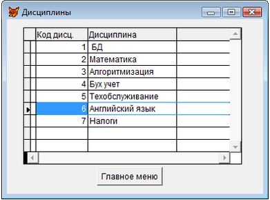 Данный модуль вызывается из главной формы при нажатии на кнопку «Дисциплины». На данной форме размещен объект grid который имеет свойство readonly=True, чтобы пользователь мог только просматривать информацию, так же у объекта grid имеются дополнительные компоненты header для каждой колонки (всего их 2) , в свойствах caption которых описывается название колонки. Объект Column1 (первая колнка) связан с атрибутом kodsdisc (код дисциплины) таблицы disiples для вывода в этой колонке всех кодов. Для второй колонки используется атрибут name таблицы disiples, чтобы в данных колонках были записаны названия дисциплин. Также на форме размещена кнопка перехода на форму «Главное меню»