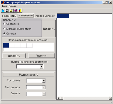 Для создания нового МП-транслятора необходимо выбрать из меню файл Новый. Добавить символы, состояния, магазинные символы с помощью кнопки Добавить.