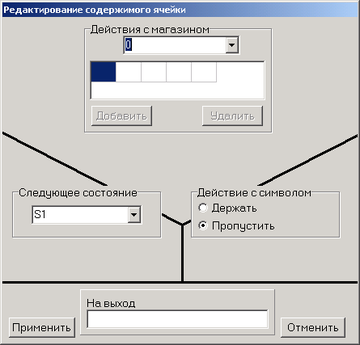 В функцию передается цепочка алфавитных символов, подлежащая разбору, организовывается цикл в котором осуществляется переход между состояниями автомата по параметрам считываемым из массива ячеек. В случае если автомат переходит в состояние ошибки или достигается максимальное число итераций(50000) цикл прекращается и выдается сообщение о не допуске цепочки, цикл продолжается пока входным символом не будет символ конца цепочки, если цикл был завершен нормально то организуется проверка, находится ли состояние в котором закончил работу автомат среди допустимых, и выдается соответствующее сообщение. Для реализации магазина создается объект типа TmyStack, который дает возможность вталкивать цепочку магазинных символов, выталкивать верхний символ, заменять верхний символ на цепочку, выдавать верхний символ.