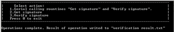 Выбрав действие, программа производит необходимые действия и записывает результаты в файлы: цифровая подпись записывается в signature.txt, а результат проверки подписи – в verification result.txt.