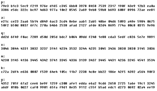 for(int i=0;i {fseek(fp,curpos,SEEK_SET); fscanf(fp,"%x",&k); t[i]=k; curpos=curpos+5;} fclose(fp); return curpos;} /*запись в файл*/ int file_write(unsigned short t[], long curpos, int sz) {FILE *fp; fp=fopen("signature.txt","w"); for(int i=0;i fclose(fp); return curpos;} unsigned short sign[S]; int main() {FILE *fp1; unsigned short p[S]; unsigned short a[S]; unsigned short q[S/2]; unsigned short x[S/2]; unsigned short m[S/2]; unsigned short k[S/2]; unsigned short y[S]; long curpos=3; long cp=file_read(p,curpos,S); curpos=cp+7; cp=file_read(a,curpos,S); curpos=cp+7; cp=file_read(q,curpos,S/2); curpos=cp+7; cp=file_read(x,curpos,S/2); curpos=cp+7; cp=file_read(m,curpos,S/2); curpos=cp+7; cp=file_read(k,curpos,S/2); curpos=cp+7; cp=file_read(y,curpos,S); char symb; int c; printf("------------------------------------------------------------\n"); printf("|Select action: |\n"); printf("|1.Serial calling rountines \"Get signature\" and \"Verify signature\". |\n"); printf("|2.Get signature |\n"); printf("|3.Verify signature |\n"); printf("|Press 0 to exit |\n"); printf("----------------------------------------------------------\n\n"); do {symb=getch(); c=atoi(&symb); int rs; switch(c) {case 0: return 0; case 1: signature(p,a,q,x,m,k,sign); file_write(sign, 0, S); rs=verify(p,a,q,y,m,sign); fp1=fopen("verification result.txt","w+"); if(fp1==NULL) printf("Error: couldn't open file"); if(rs==0) fprintf(fp1, "Verification successful: u=r', signature is authentic\n"); else fprintf(fp1, "WARNING: verification unsuccessful: u!=r', signature is non-authentic\n"); printf("Operations complete. Result of operation writed to \"verification result.txt\"\n"); fclose(fp1); break; case 2: signature(p,a,q,x,m,k,sign); file_write(sign, 0, S); printf("Operation complete. Result of operation writed to \"signature.txt\"\n"); break; case 3: verify(p,a,q,y,m,sign); rs=verify(p,a,q,y,m,sign); if(rs==0) fprintf(fp1, "Verification successful: u=r', signature is authentic\n"); else fprintf(fp1, "WARNING: verification unsuccessful: u!=r', signature is non-authentic\n"); printf("Operation complete. Result of operation writed to \"verification result.txt\"\n"); break; default: printf("Wrong number. Try again\n"); break;}} while(1);} Function.cpp #include "function.h" #include "INTERFS.h" void signature(unsigned short sign_p[], unsigned short sign_a[], unsigned short sign_q[], unsigned short sign_x[], unsigned short sign_m[], unsigned short sign_k[], unsigned short sign[]) {unsigned short w[S*2]; unsigned short res[S]; unsigned short result[S]; unsigned short tmp[S/2]; unsigned short tmp1[S/2]; unsigned short sum[S+1]; unsigned short s[S+1]; exp_mod(sign_a,sign_k,sign_p,res,w,S,S/2); Div(res,sign_q,result,tmp,S,S/2); mul(sign_x,tmp,res,S/2,S/2); mul(sign_k,sign_m,result,S/2,S/2); add(res,result,sum,S); Div(sum,sign_q,s,tmp1,S,S/2); for(int i=S/2-1, j=S-1; i>=0; i--, j--) {sign[j]=tmp[i]; sign[j-16]=tmp1[i];}} int verify(unsigned short p[],unsigned short a[],unsigned short q[],unsigned short y[], unsigned short m[],unsigned short sign[]) {unsigned short v[16]; unsigned short q_2[16]; unsigned short w[S]; unsigned short s[S/2]; unsigned short tmp[S]; unsigned short tmp_[S]; unsigned short tmp_1[S*2]; unsigned short tmp_2[S*2]; unsigned short tmp1[S/2]; unsigned short z1[S/2]; unsigned short z2[S/2]; unsigned short r_[S/2]; for(int i=S/2-1; i>=0; i--) q_2[i]=q[i]; q_2[0]=q_2[0]-0x0002; exp_mod(m,q_2,q,v,w,S/2,S/2); for(int b=S/2-1, j=S-1; b>=0; b--, j--) {s[b]=sign[b]; r_[b]=sign[j];} mul(s,v,w,S/2,S/2); Div(w,q,tmp,z1,S,S/2); sub(q,r_,tmp1,S/2); mul(tmp1,v,w,S/2,S/2); Div(w,q,tmp,z2,S,S/2); exp_mod(a,z1,p,tmp,w,S,S/2); exp_mod(y,z2,p,tmp_,w,S,S/2); mul(tmp,tmp_,tmp_1,S,S); Div(tmp_1,p,tmp_2,tmp,S*2,S); Div(tmp,q,tmp_,s,S,S/2); return comp(s,r_,S/2);}