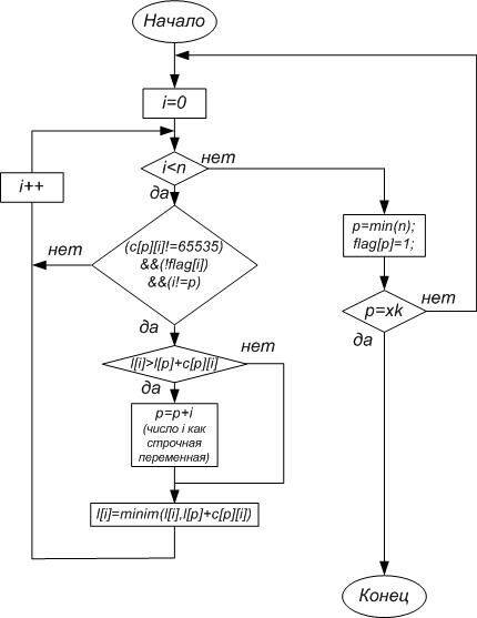 for(i=0;i if(!(flag[i])) result=i; for(i=0;i if((l[result]>l[i])&&(!flag[i])) result=i; return result; } word minim(word x, word y) { if(x return y; } void main() { cout<<"Vvedite kolichestvo tochek: "; cin>>n; for(i=0;i for(j=0;j for(i=0;i for(j=i+1;j { cout<<"Vvedite rasstoyanie ot x"< cin>>c[i][j]; } cout<<" "; for(i=0;i cout< for(i=0;i { printf("X%d",i+1); for(j=0;j { printf("%6d",c[i][j]); c[j][i]=c[i][j]; } printf("\n\n"); } for(i=0;i for(j=0;j if(c[i][j]==0) c[i][j]=65535; //бесконечность cout<<"Vvedite nachalnuy tochku: "; cin>>xn; cout<<"Vvedite konechnuy tochku: "; cin>>xk; xk--; xn--; if(xn==xk) { cout<<"Nachalnaya I konechnaya tochki sovpadayt."< getch(); return; } for(i=0;i { flag[i]=0; l[i]=65535; } l[xn]=0; flag[xn]=1; p=xn; itoa(xn+1,s,10); for(i=1;i<=n;i++) { strcpy(path[i],"X"); strcat(path[i],s); } do { for(i=0;i if((c[p][i]!=65535)&&(!flag[i])&&(i!=p)) { if(l[i]>l[p]+c[p][i]) { itoa(i+1,s,10); strcpy(path[i+1],path[p+1]); strcat(path[i+1],"-X"); strcat(path[i+1],s); } l[i]=minim(l[i],l[p]+c[p][i]); } p=min(n); flag[p]=1; } while(p!=xk); if(l[p]!=65535) { cout<<"Put: "< cout<<"Dlina puti: "< } else cout<<"takogo puti ne syshestvuet!"< getch(); } Приложение Б Результат Приложение В Схема программной реализации алгоритма Дейкстры