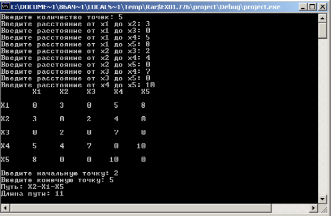 Результатом программы является вывод на экран вершин, через которые проходит минимальный путь, а также вывод длины маршрута. Если пути между заданными точками не существует – выводится соответствующее сообщение.