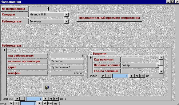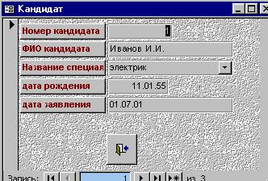 Ежедневно в начале рабочего дня или по мере поступления в БД вводятся оперативные данные. Это осуществляется путем выбора пункта меню "Входные документы" в главной форме. Для ввода новых кандидатов необходимо выбрать кнопку “Кандидат”, для ввода новых фирм и вакансий от них необходимо нажать кнопку “Работодатель” и ввести данные, для ввода нового направления необходимо нажать кнопку “Направление”