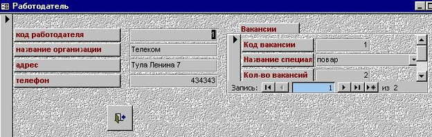 Для запуска АИСС "Служба занятости" необходимо загрузить СУБД Accses. В СУДБ открыть файл " Служба занятости.mbd". Произойдет загрузка АИСС и на экране появится главное меню системы.
