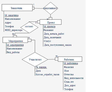 На данной ER-диаграмме видно, что для разработки данной системы необходимы 4 сущности: Заказчик, Проект, Работник, Мероприятия. Данные сущности соединяют 3 связи.