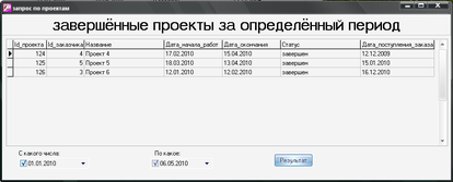 2) Выбор завершённых проектов за период, определяемый пользователем.