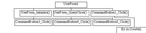 CommandButton1_Click() – процедура, срабатывающая при нажатии кнопки «Найти корни», которая производит вычисления и записывает результат.