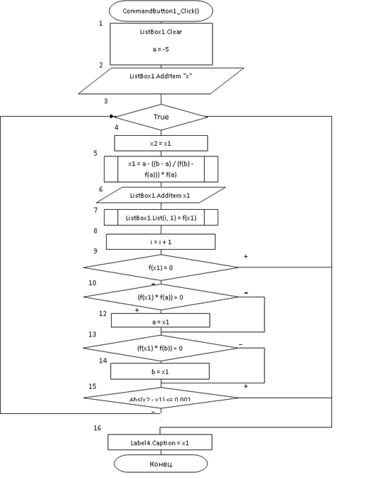 Если |b a| ( - заданная погрешность вычислений) или |f(x1)| < 1 (1 – заданное значение шума), то принять в качестве решения последнее значение x1, вывести его и прекратить вычисления, в противном случае перейти к шагу 2.
