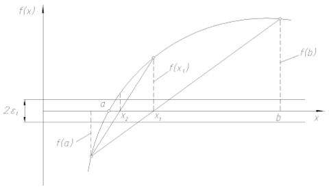 Очередное приближение теперь в отличие от метода деления отрезка пополам берем не в середине отрезка, а в точке х1, где пересекает ось абсцисс прямая линия, проведенная через точки f(a) и f(b) (рисунок 1).