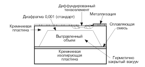 Датчик абсолютного давления. Абсолютное давление, такое как барометрическое давление, измеряется относительно вакуума во встроенной в кристалл датчика полости.