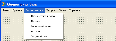 Пункт меню «Справочники» имеет подпункты «Абонентская база, «Абонент», «Тарифный план», «Услуга», «Лицевой счет». Данные пункты предназначены для вывода одноименных окон для просмотра или редактирования информации.