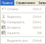 Пункт меню «Правка» содержит стандартный набор подпунктов: «Отмена», «Вырезать», «Копировать». «Вставить», «Удалить», и «Выделить все».