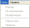 Пункт меню «Окно» содержит стандартный набор подпунктов для работы с окнами: «Каскад», «По горизонтали», «По вертикали», «Скрыть все» и «Закрыть». При работе программы под подпунктом «Закрыть» появляются наименования открытых оконных форм.