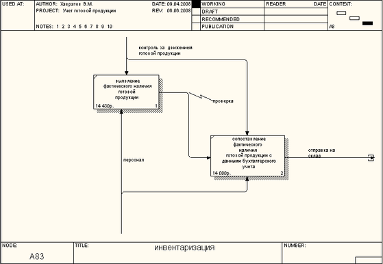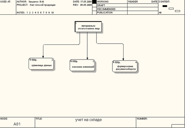На рис 1.1 представлена контекстная диаграмма. На рис 1.2 представлена декомпозиция контекстной диаграммы. «Производство Кваса». Процесс производства включает учет готовой продукции, для которого была создана декомпозиция рис 1.3. «Учет на складе» рассмотрен с помощью диаграммы DFD рис 1.4, в которой содержится: