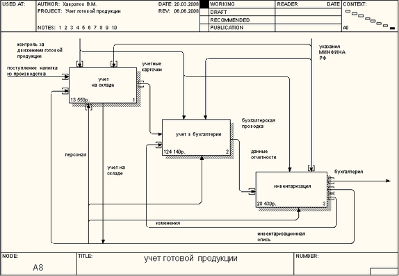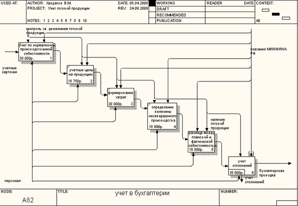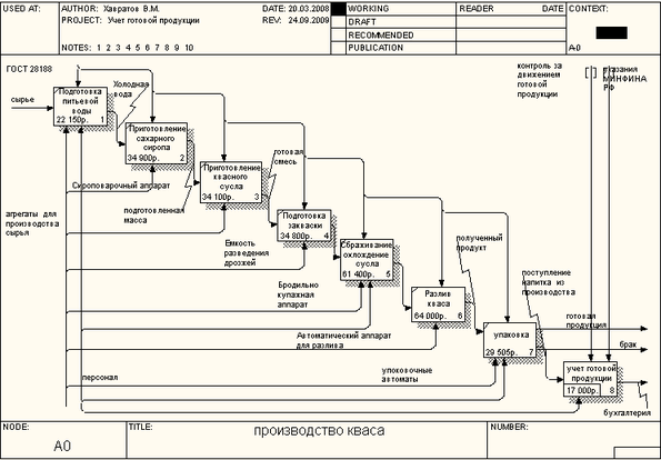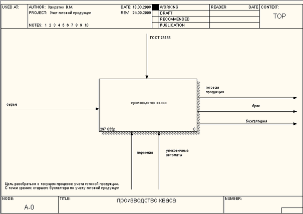 Главной технологической операцией является производство и учет готовой продукции. В качестве исходных данных используется сырье – изображается с помощью стрелки входа. Результат – готовая продукция – учет на складе и в бухгалтерии изображается с помощью стрелки выхода, исполнители данной технологической операции – это персонал, также осуществление данной операции происходит с помощью упаковочных автоматов – изображается с помощью стрелок механизмов. Правила, которыми руководствуется данная работа – это ГОСТ 28188 то есть соответствие производимой продукции – изображается с помощью стрелок управления. (рис 1.1)