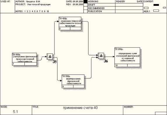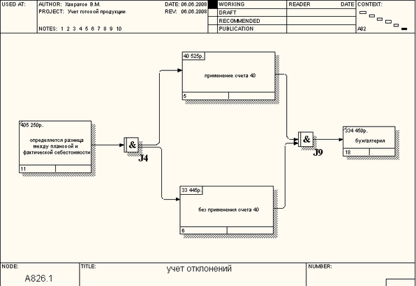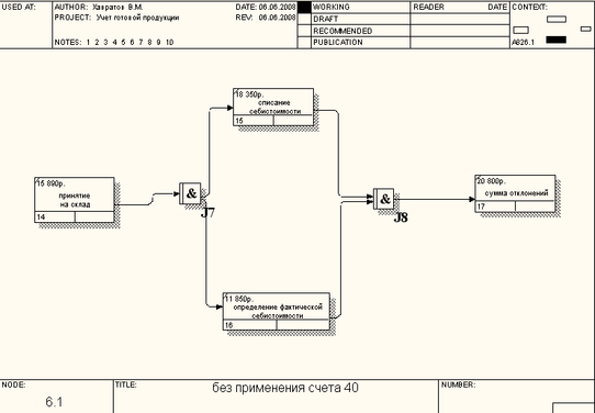 Сущность – материально ответственное лицо, которое осуществляет учет, вносит изменения и сдает на сверку в бухгалтерию. «учет в бухгалтерии» рис 1.5 состоит из нескольких разделов. «Учет отклонений» рис 1.6 делиться на декомпозиции с применением счета 40 и без применения счета 40 в одном из которых представлена диаграмма IDEF3 рис 1.7. На рис 1.8 представлена декомпозиция «без применения счета 40. И на рис 1.9 представлена инвентаризация, которая включает в себя два процесса :