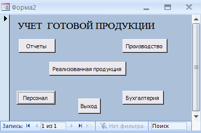Главная форма (рис 3.3) позволяет просмотреть список персонала, список реализованной продукции, различные виды отчетов, данные бухгалтерии и данные о производстве.