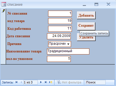 Форма «Списание» позволяет просмотреть наличие бракованной продукции.(Рис 3.14)
