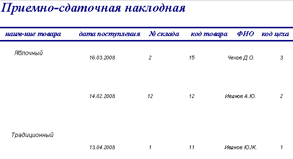 Отчет «Приемно-сдаточная накладная» (рис. 3.7) отражает наименование товара, дату поступления, номер склада, код товара и ФИО сотрудника и код цеха.