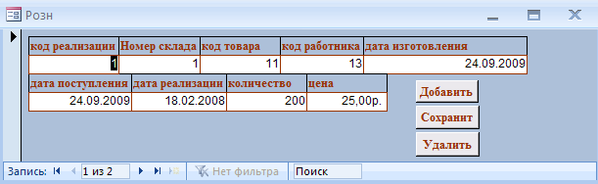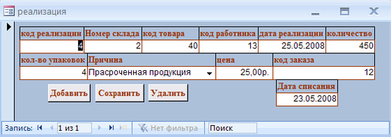 Форма «Реализация» позволяет увидеть всю реализованную продукцию, где она храниться, когда была реализована и многое другое. (Рис 3.18)