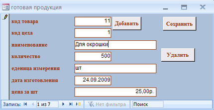 Следующая форма позволяет просмотреть данные о готовой продукции. (Рис 3.12). Можно добавить, сохранить и удалить запись.
