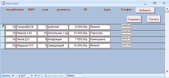 Форма «Персонал» (рис 3.4) позволяет просмотреть данные о персонале предприятия, а так же добавить в него новых сотрудников.