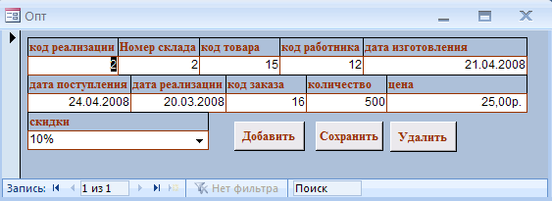 Форма «Опт» позволяет просмотреть оптовую продукцию. (Рис 3.16)