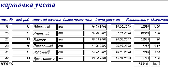 Отчет «Карточка учета» (рис. 3.9) отражает номенклатурный номер, код работника, наименование товара, единицу измерения, дату поступления, дату реализации, сколько продукции было реализовано и какой был остаток. В данном отчете можно просмотреть сумму остатка и реализованной продукции.