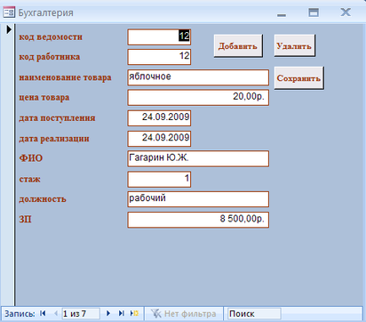 Форма «Бухгалтерия» (рис. 3.5) отражает данные о товаре: его цене, дате поступления и реализации, а так же о персонале, стаже и должности, з\п сотрудникам.
