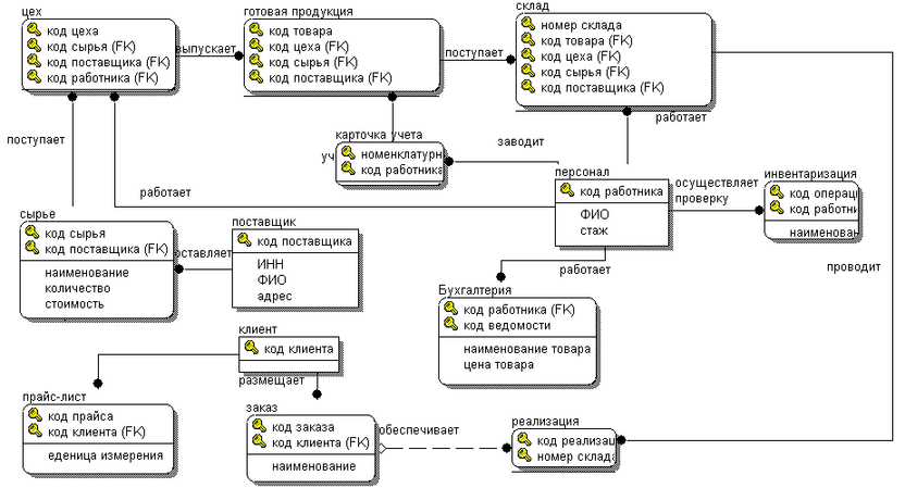 13) цех (код цеха, код сырья, код поставщика, оборудование, код работника)