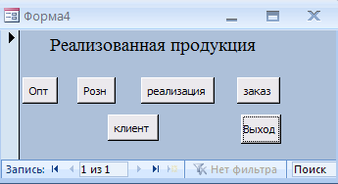 Форма «Реализованная продукция» позволяет просмотреть запросы данных о клиентах, оптовую, розничную продукцию, данные о заказах. (Рис 3.15).
