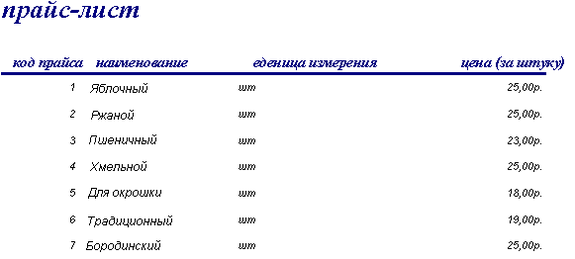 Отчет «Прайс-лист» (рис. 3.8) отражает код прайса, наименование товара и цену за штуку.